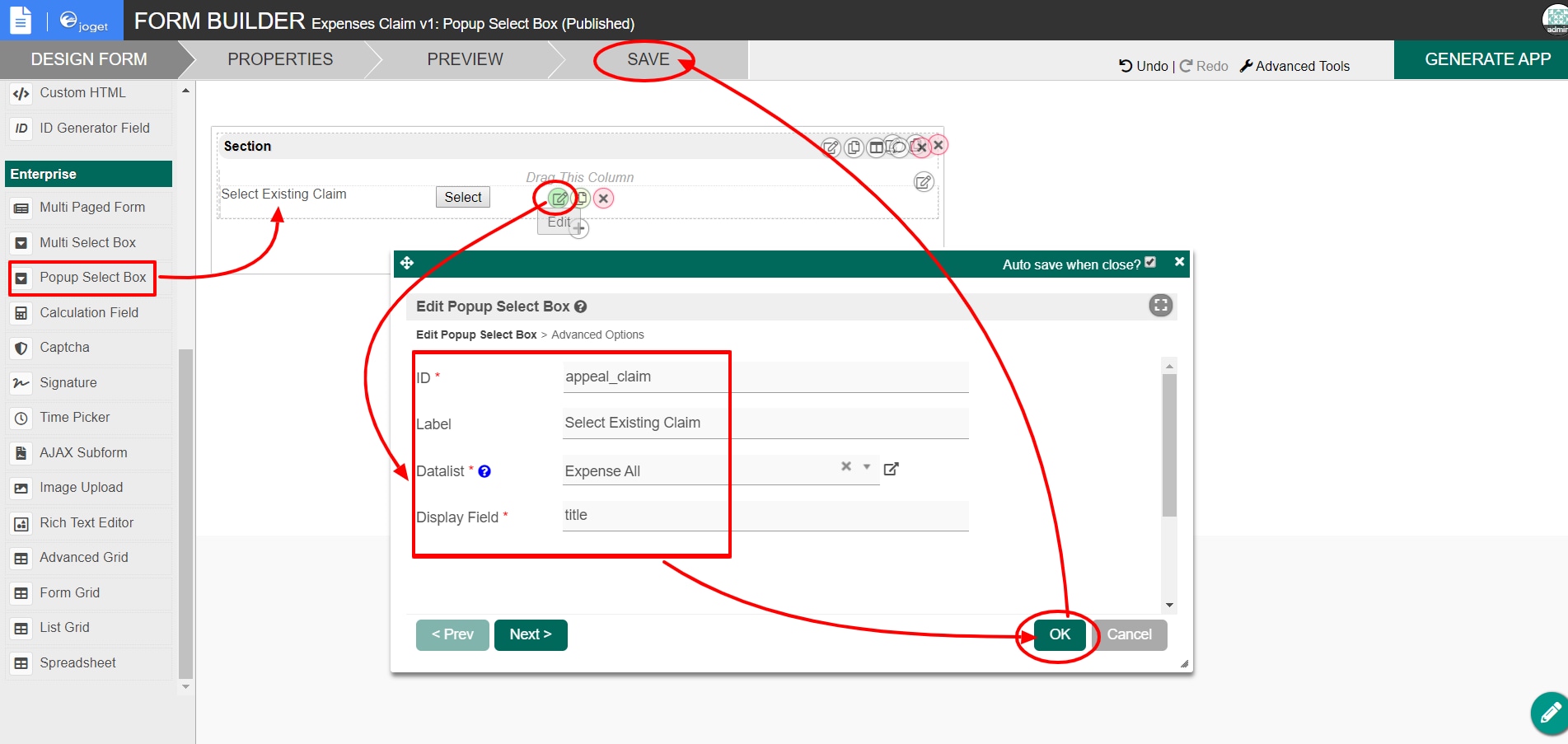 The easiest way to see how the Popup Select Box works are to use the existing built-in App Expenses Claims. Here are the steps: