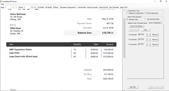 e. Click Add Reference to add the marked string as reference. This button is not available if you are editing an existing reference. f. Click Update to update the edited reference. This button is not available if you are adding a new reference. Field ConfigurationIt lets you create or modify fields to extract a block of data or tabular data from the PDF file. Fields are a set of configurations that include reference points, rectangular boundaries or even excluded areas to effectively extract the required data. For precision, you can provide related coordinates of the area from where the data must be extracted.