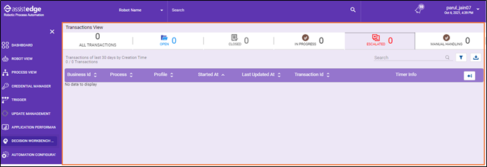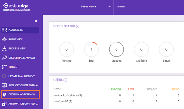 This is a default homepage of decision workbench. Applicable, if the Decision Workbench process is not created in the Studio or the robot is not created to trigger the Decision Workbench process. |