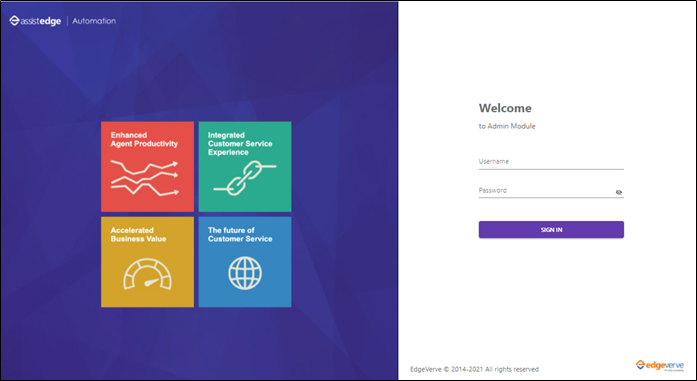 - Enter Username and Password and click SIGN IN. The Admin Module page appears.