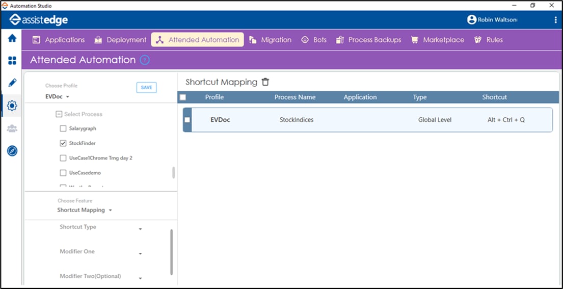 This feature lets you map shortcut keys with a process. The mapped shortcut keys can be used to trigger automation via attended automation bots.