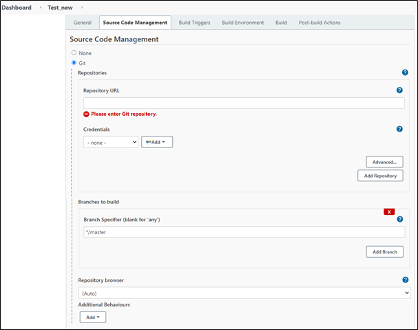 - In the Credentials field, select the credentials that you want to use to access the Git repository. You can select the required credentials if it has already been added earlier or add new credential at this point of time.