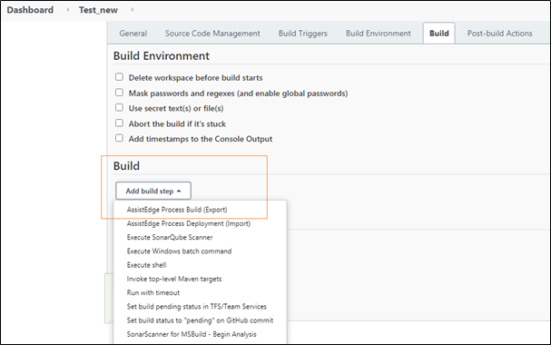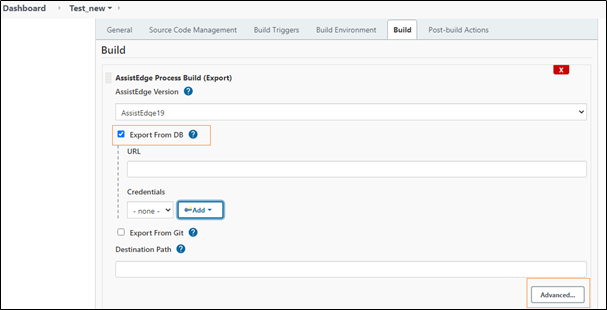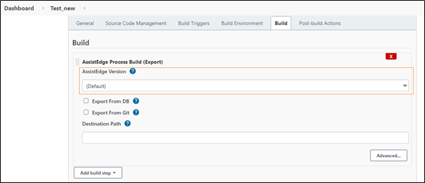 - In the Build section, click Add Build Setup to expand and select the AssistEdge Process Build (Export) option.