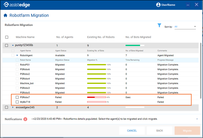 - The migration for RobotAgent is successful, but it fails to migrate some of the bots.
