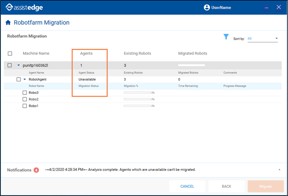 If RobotAgents are not visible at the time of RobotFarm migration, ensure that TxnStore component is running and TxnStore migration with previous version data folder is successful.