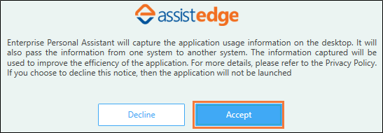 After loading, the Enterprise Personal Assistant bot gets launched and the data privacy notice/privacy disclaimer pop-up window appears.