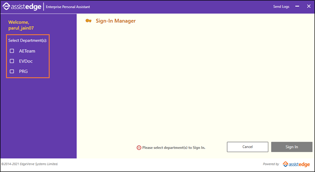 Click Send Logs in the Sign-In Manager window if there is an error during sign in. The system composes an email with the following details:
