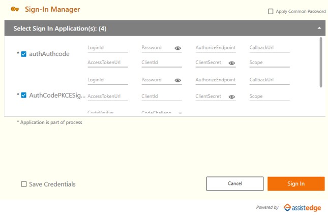 - In case the process is containing OAuth Activity, then you are required to enter the details as per the configurations performed for OAuth activity type which includes Authorization Code, Authorization Code with PKCE, Client Credentials, Implicit Grant and Resource Owned Password Protected, TOTP, and Auth Manager. For more information, see AE-RPA-Engage-Automation Studio Manual.