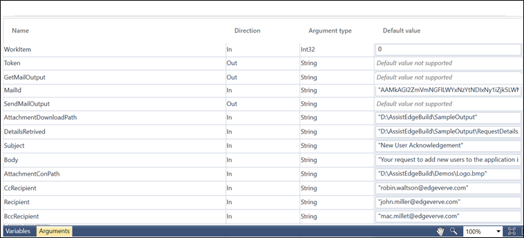 - AttachmentConPath- an In argument to save and pass the company logo as attachment with the email.