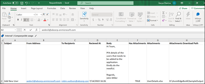 The access request email contains an excel file, UserDetails.xlsx, with the details of the new users that you want to save for further processing. Below is the sample email received: