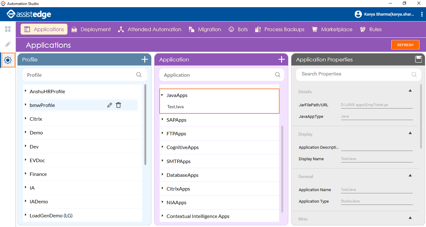 - In the Select An Application list, select the configured Java application that you want to automate. Alternatively, you can add a new Java application at this point of time. To add a Java application: