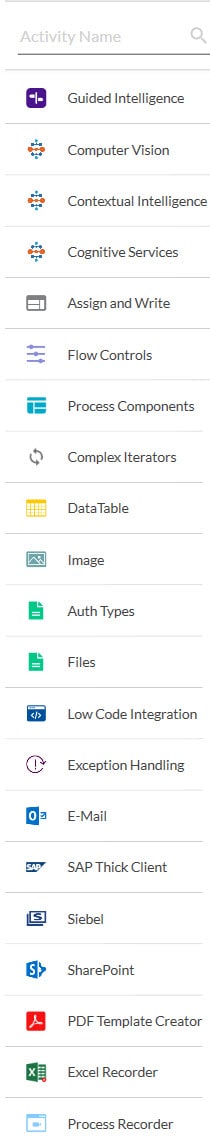 Activity are pre-defined, out-of-box operators in Automation Studio. They are the building blocks that enables you to create the automation process workflow. Similar activities are clubbed under one tool category for an easy navigation.