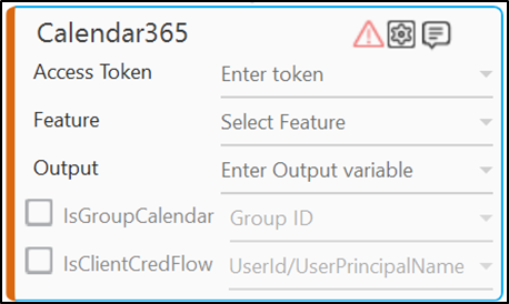 The access token can be retrieved either from the Oauth activity present in the same or in another process workflow. For more information, see OAuth Activity. - Select the IsGroupCalendar checkbox, if you want to perform automation using a Group calendar.
