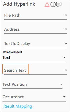 - To insert hyperlink with respect to the text: From the Search Text dropdown list, select the In argument holding the text to be searched. The argument must be of String type.