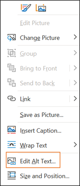- Right click the image you want to add the alt text to and select Edit Alt Text.