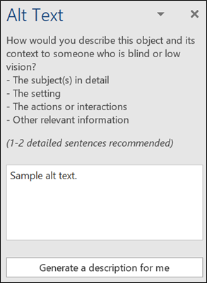 - Add the alternate text in the Alt Text window in the right panel and close the Alt Text window.