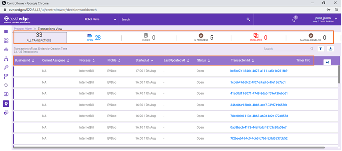 - All Transactions: You can view all the last 30 days' automation requests that appeared in Decision Workbench. It helps you to know the total numbers of request appeared for process SMEs.