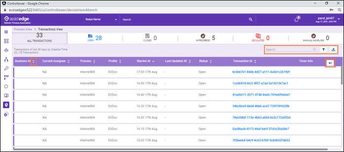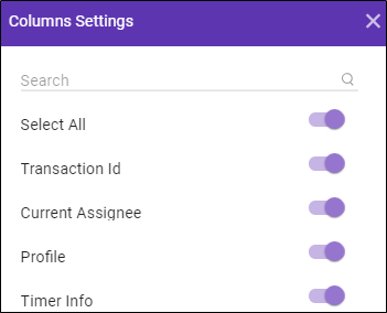 - Toggle to select and deselect the column display settings. The available toggles are Select All, Transaction Id, Current Assignee, Profile, Timer Info.