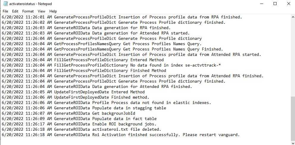 - ROI data generation progress status can be found from file $\AssistEdgeAutomation\app\Vanguard\activateroistatus.txt file. On completion the file will have an entry GenerateROIData Roi Activation finished successfully.”