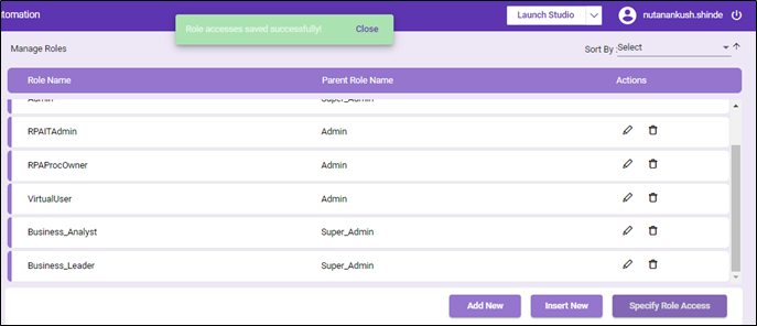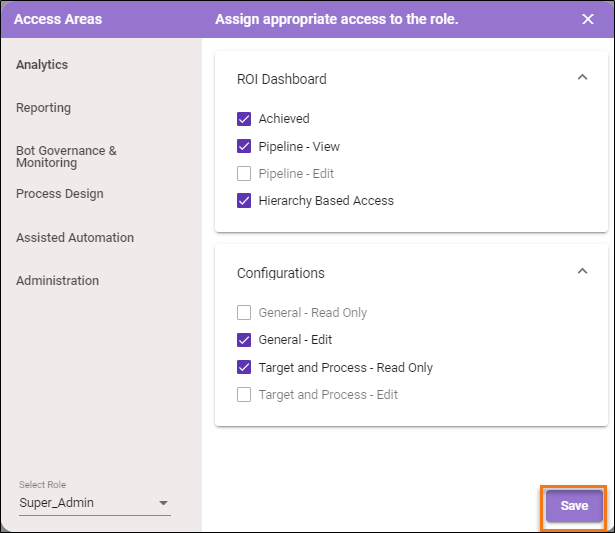- In the Access Areas, select the type of access and in the Assign appropriate access to the role., select the check box corresponding to which you want to assign access for the user role.