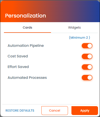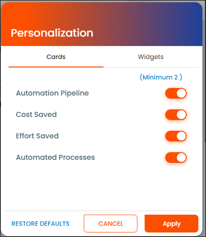 The ROI Analytics can be updated using the personalization option in the user settings. Personalization window contains two tabs which include Cards and Widgets. You can enable or disable the cards or widgets as per preference. You are required to enable at least two cards and widgets each in the Automation Program Insights.