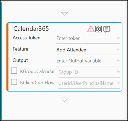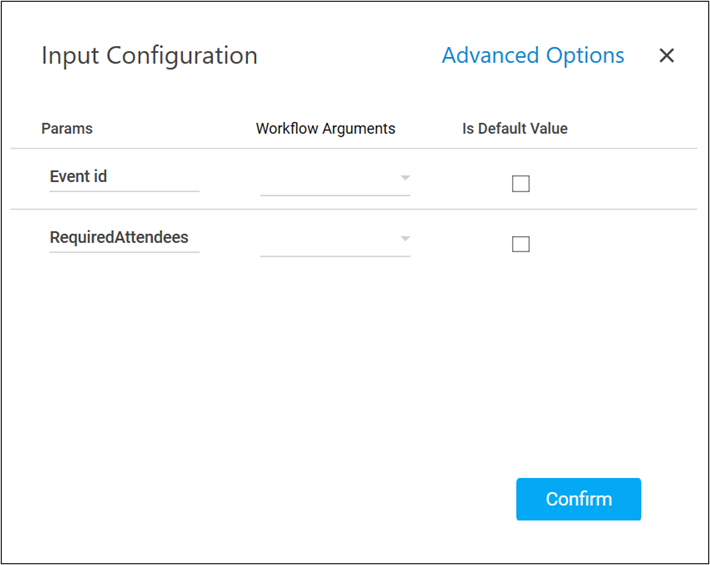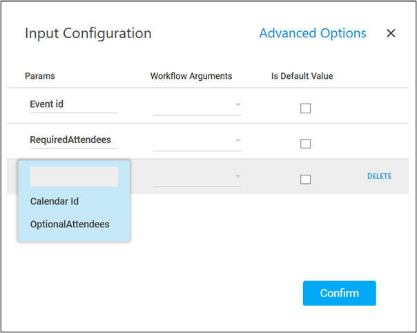 - Click Advanced Options and select Calendar Id. Corresponding to the Calendar Id parameter, select the String type argument holding the unique identifier of the calendar where you want to add attendees to the specified event.
