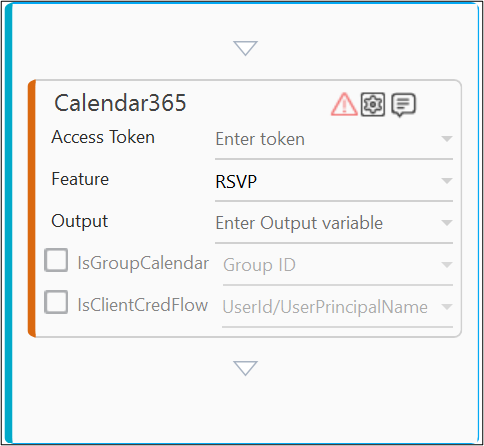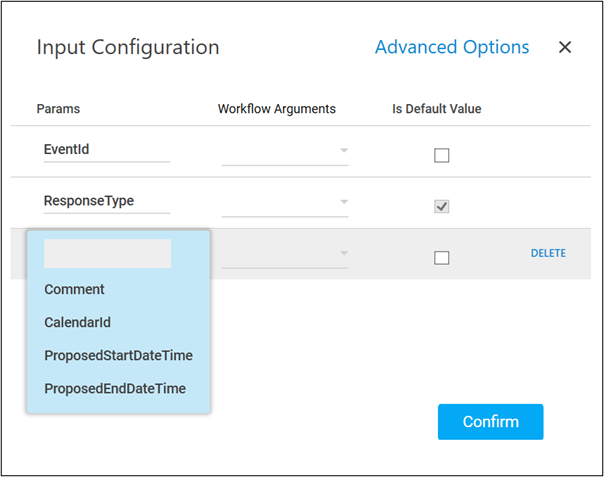 - Click Advanced Options and select CalendarId. Corresponding to the CalendarId parameter, select the String type argument holding the unique identifier of the calendar to which you want to send the RSVP.