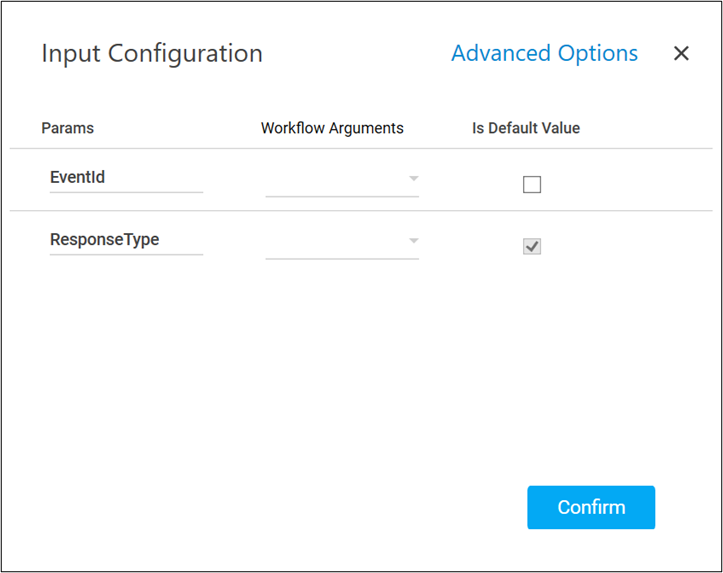 You can use the Search Event feature to obtain the required event Id - Corresponding to the ResponseType parameter, select the required option from the Workflow Arguments dropdown list. Available options are – accept, tentativelyAccept and decline.