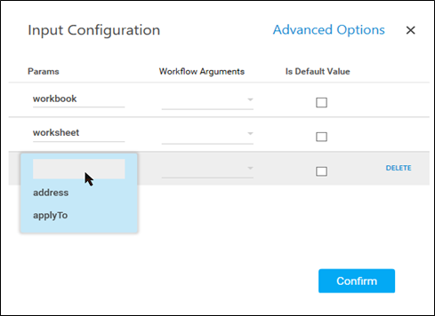 - Ensure to define all the input parameters as an in argument in the Parameter bar for selection in the mandatory and advanced options.