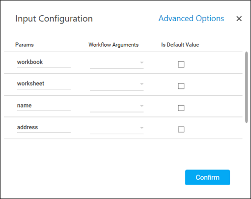 - Ensure to define all the input parameters as an in argument in the Parameter bar for selection in the mandatory and advanced options.