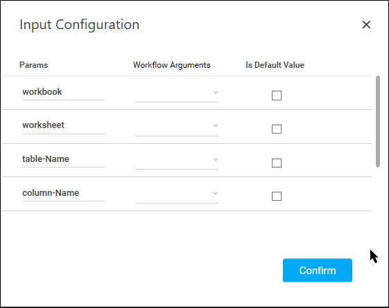 - In the table-Name, select the parameter holding the name of the table in the excel file.