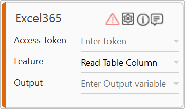 - The validation error symbol disappears when you select relevant values in the particular field from the available list. For example, Access Token, Read Range, and Output.