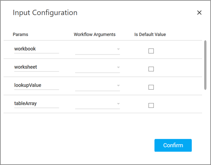 VLookup Range feature does not have any optional parameters to define. - You can select the Is Default Value checkbox to set the selected input parameter as the default value.