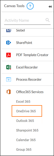 - In the Canvas Tools pane, click Office 365 Services to expand the tool and view the associated activities.