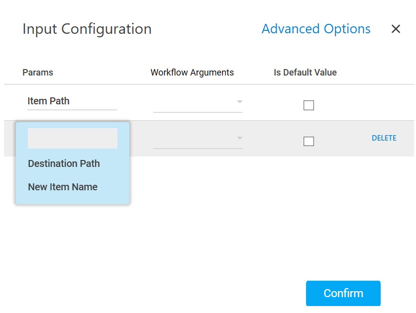 (Setting) icon to configure the input parameter item path for copying the file or folder and configuring advance options. The Input Configuration screen appears.
