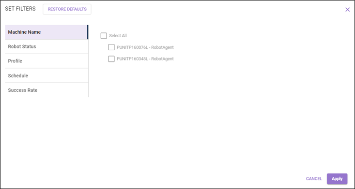 Enables you to filter the robots using machine name. The robot agents list is displayed based on the access provided to the logged in user. In the left panel, select Machine Name > select the preferred <robot_agent> check box to view robot status according to selected robot agent. |
