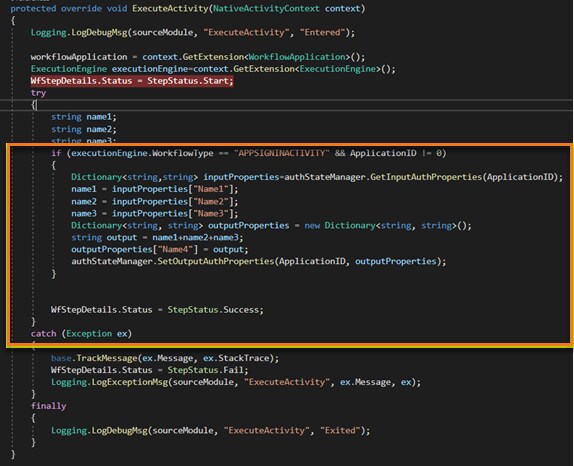 - Following is a sample implementation of the execute activity logic if it is placed inside a sign-in process