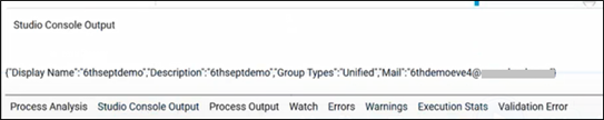 The output received is in the JSON array format displaying the Display Name, Description, Group Types and Email Id of the specified group. You can use the JSON activity to utilize the Object Id as per your need.