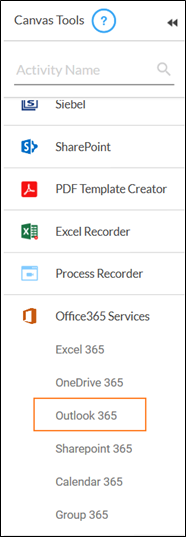 - In the Canvas Tools pane, click Office 365 Services to expand the tool and view the associated activities.