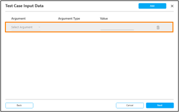 - If you have added any row for Test Case Input argument, then selecting the argument and providing the test data in the Value field is a mandatory step.