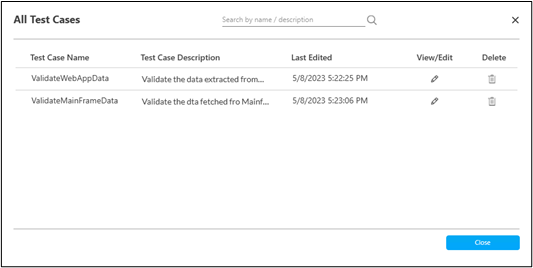The All Test Cases dialog box displays all the test cases available for the given process. You can edit and delete the test cases from this window if you have Process Tester access. The table appears empty if no test cases are created for the current open process.