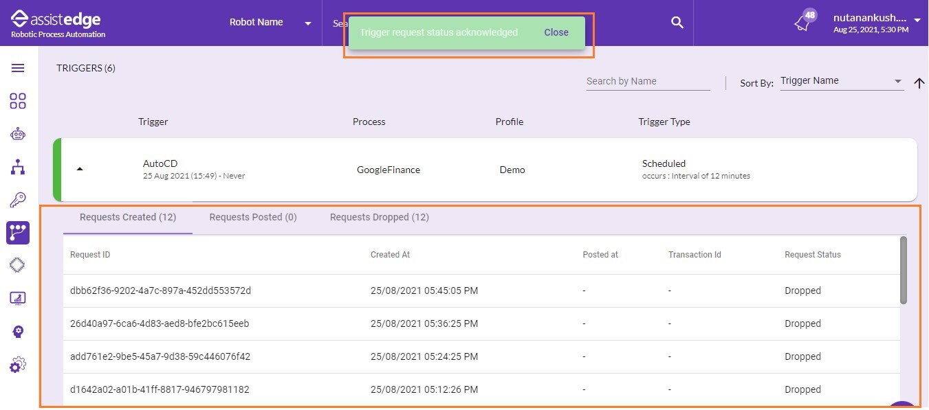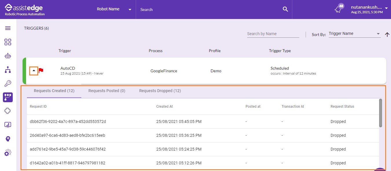 In-case, trigger request fails to reach the listener components, then that request will appear in Request Dropped tab. To know more information about the scenarios in which the trigger request fails or drops, see Request_Dropped.