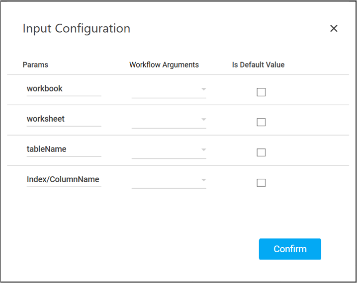 Read Table Column feature does not have any optional parameters to define. - You can select the Is Default Value checkbox to set the selected input parameter as the default value.