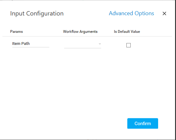 (Setting) icon to configure the input parameter item path for copying the file or folder and configuring advance options. The Input Configuration screen appears.