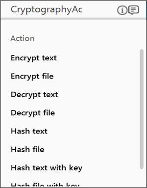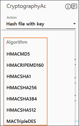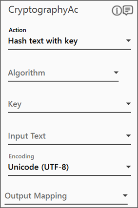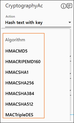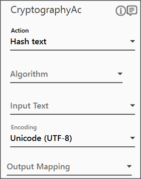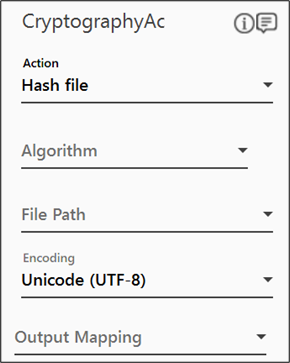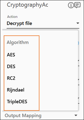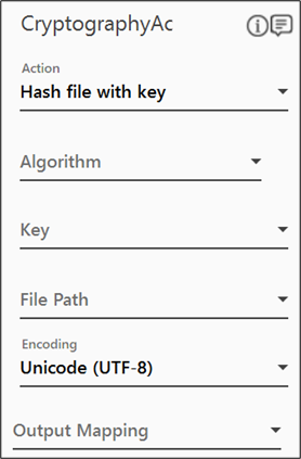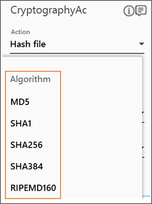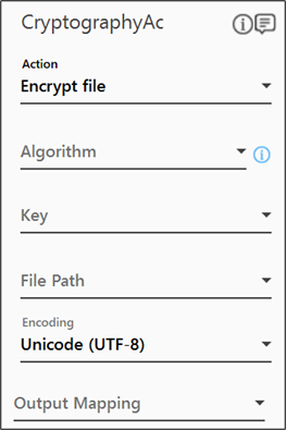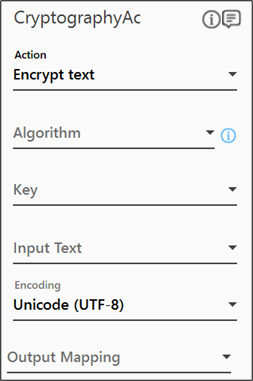 The Cryptography Activity enables you to encrypt or decrypt text or files with the help of specified algorithms, key, and encoding. This activity also enables the hashing of text or files.