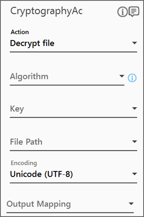 Output argument is automatically created to store relevant output, post workflow execution. - The instructions related to cryptography activity differs depending upon the action selected.