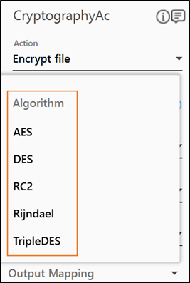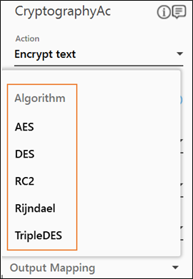 - From the Output Mapping dropdown list, select the required String type Output parameter. For more information see Using Cryptography Activity.